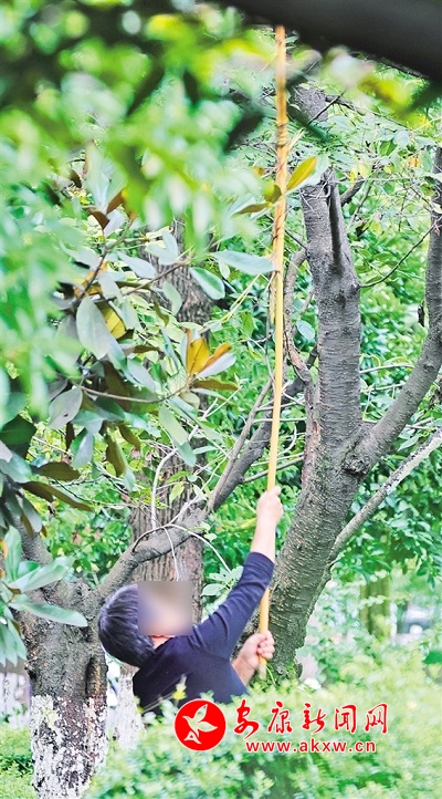 市民拿著長桿在景區(qū)附近采摘果實