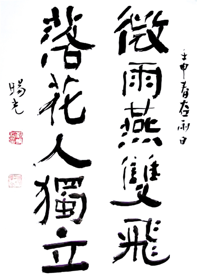 旸光先生淵博的家學,深厚的學養(yǎng)為其書法技藝開掘出流淌不盡的源泉,正是他那非凡的經(jīng)歷與盤踞胸中的郁勃之氣,鑄就了別具一格的藝術風采??v觀先生書法字里行間的布局、結構、章法,即可以領略其高深的藝術修養(yǎng)。一般書法家給自己作品題款尚膽怯,更何況給山水畫人物、花鳥畫題款署名,書寫跋語,要求書者不但有深厚的文學功底賦詞作詩,再根據(jù)畫面的風格,畫中所留空白虛實照應,用筆用墨的變化去應對,好的款跋使作品升華。而先生無論行、草、隸、篆,縱橫涂抹,信手拈來如行云流水,宛若天成,令人折服,先生曾為不少后學作品撰寫款名,跋語至今記憶猶新。