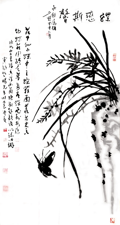 1988年,中國畫壇號稱“蝶王”的王冰如女士,以80歲高齡回到她曾工作生活10年之久的第二故鄉(xiāng)安康舉辦畫展,并且以詩書畫會友,特邀旸光先生和金州著名詩人劉寅初老人同游香溪,冰如老師興之所至,巧繪墨蝶,說道“人言寅初老弟有曹子健七步成詩之才,今日以十步為限,將此畫為題,賦詩一首,旸光老弟書于其上如何?”寅初老只走了三步便道有了,于是順口吟誦,旸光先生揮毫急就“花中仙子蝶中王,蝶舞籣叢花更香,化蝶莊周終是夢,喜看蝶王飛安康。”一筆流暢的行草躍然于畫上,相輔相成,真是詩情畫意天作之合。一幅難遇難得難覓的“三絕圖”誕生了。冰如老師感慨萬千,說到“二位弟臺才高八斗,只可惜待在安康這個貧瘠的地方被埋沒了也!”這個場面是一種巧合,正是旸光先生“萬事隨緣”的結晶,爾后經(jīng)書壇大家陳少默先生為之題跋做款,更是錦上添花,成了四絕圖。冰如、少默、旸光、寅初先生已然作古,這段翰墨丹青之情,將永存世間傳為藝術佳話。