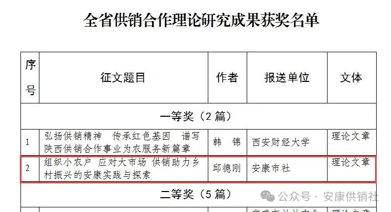 按:本文系安康市供銷合作社黨組書記、理事會(huì)主任邱德剛署名理論文章,立足供銷助力鄉(xiāng)村振興的安康實(shí)踐與探索,深入闡述了“組織小農(nóng)戶應(yīng)對大市場”的內(nèi)在邏輯,把群眾“組織起來”投身經(jīng)濟(jì)合作的實(shí)踐方法,在助力鄉(xiāng)村振興、推進(jìn)共同富裕實(shí)踐中探索出一條可復(fù)制可推廣的典型經(jīng)驗(yàn),其理論內(nèi)涵、實(shí)踐邏輯為在推進(jìn)鄉(xiāng)村振興中更好發(fā)揮供銷社的獨(dú)特優(yōu)勢和重要作用提供了有益參考,具有較強(qiáng)的指導(dǎo)意義。該文在中華全國供銷總社和陜西省供銷總社“薪火相傳七十載,砥礪奮進(jìn)新時(shí)代”主題征文中獲評“全省供銷合作理論研究成果一等獎(jiǎng)”。