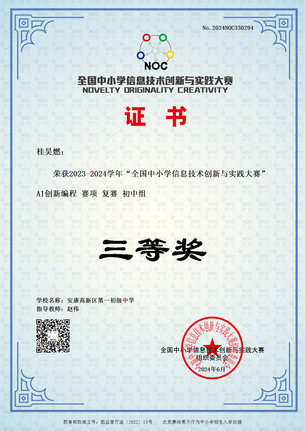 本網(wǎng)訊(通訊員 趙偉)近日,高新區(qū)第一初級(jí)中學(xué)桂昊燃同學(xué)在全國中小學(xué)信息技術(shù)創(chuàng)新與實(shí)踐大賽復(fù)賽中榮獲三等獎(jiǎng),該生由趙偉老師指導(dǎo)。