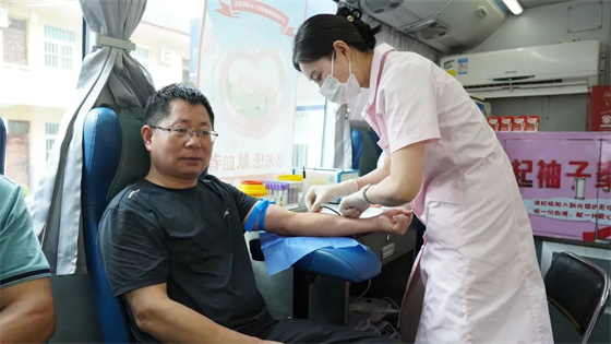 活動現(xiàn)場,無償獻血志愿者在醫(yī)務(wù)人員的引導(dǎo)下有序進行登記、體檢、測血壓。紅色的血液從血管中抽出,緩緩流進輸血袋,一袋袋鮮紅的血液和一張張光榮的獻血證,傳遞著愛心和希望。