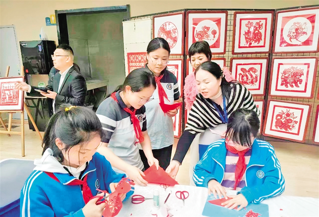 走進(jìn)張莉的課堂里,滿目色彩繽紛的剪紙作品,大大小小地陳列在展臺處。整整齊齊的桌凳圍成一個個不同形狀,以便于學(xué)生更好地進(jìn)行交流。她用學(xué)生通俗易懂的語言為學(xué)生傳授剪紙技巧:“同學(xué)們,我們首先把需要用的彩紙對折接著裁剪出合適的大小。然后再描出自己想要剪出的形狀……”通過紙張?jiān)谥讣鈦砘胤D(zhuǎn),手中的剪刀“咔嚓咔嚓”,一幅幅美輪美奐的作品便呈現(xiàn)在眼前。每周張莉都要給學(xué)生們上幾節(jié)美術(shù)課,這也讓很多學(xué)生對剪紙產(chǎn)生了濃厚的興趣,創(chuàng)造出很多優(yōu)秀作品。