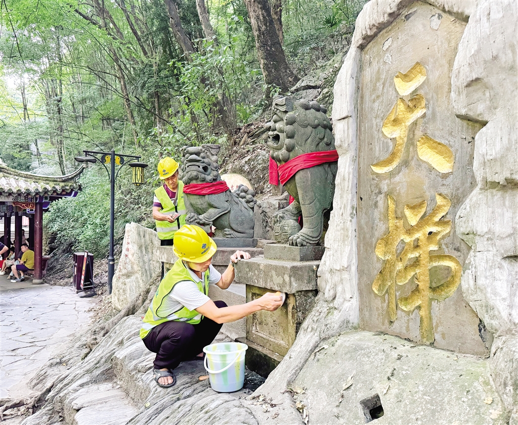 8月22日,工作人員正在香溪洞開展景區(qū)設(shè)施清理工作。據(jù)施工現(xiàn)場負(fù)責(zé)人介紹,香溪洞風(fēng)景名勝區(qū)管理局將會(huì)對供水、供電、照明等設(shè)施進(jìn)行升級改造。(鄒一銘 攝)