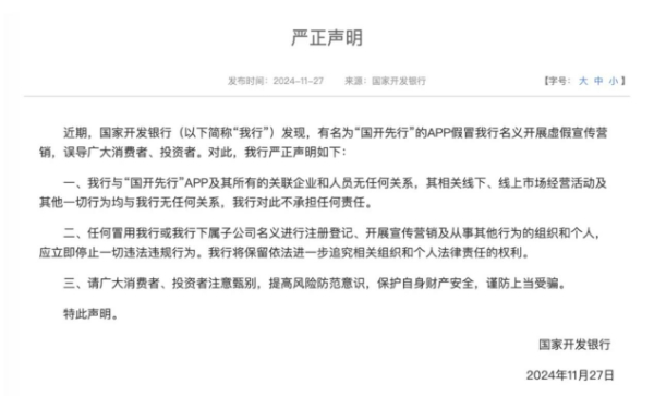 詳情:近期,有名為“國開先行”的APP假冒國家開發(fā)銀行名義開展虛假宣傳營銷,誤導(dǎo)廣大消費(fèi)者、投資者。對此,國家開發(fā)銀行于11月27日在官網(wǎng)發(fā)布《嚴(yán)正聲明》:
