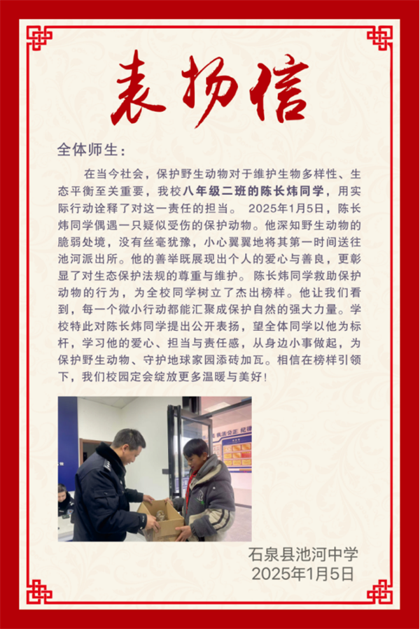 陳長煒的暖心事跡傳到學(xué)校后,學(xué)校發(fā)布了表揚(yáng)信,公開表揚(yáng)陳長煒同學(xué)的愛心善舉和保護(hù)野生動(dòng)物的暖心行為。號召全體學(xué)生要學(xué)習(xí)陳長煒的愛心、責(zé)任和擔(dān)當(dāng),從小事做起,從自身做起,保護(hù)野生動(dòng)植物,為保護(hù)地球家園、尊重生態(tài)文明的多樣性貢獻(xiàn)力量。?
