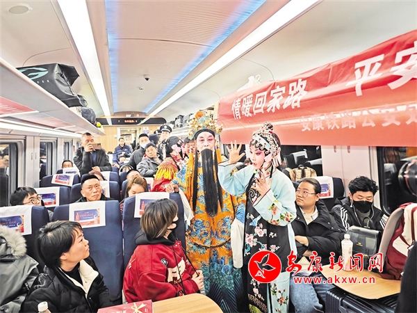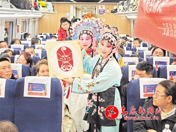 火車(chē)穿越秦巴山水間,途中,來(lái)自安康漢調(diào)二黃研究院的專(zhuān)業(yè)演員和地方民間漢調(diào)二黃愛(ài)好者們一同表演了國(guó)家級(jí)非物質(zhì)文化遺產(chǎn)——漢調(diào)二黃經(jīng)典戲曲演唱,并為旅客們講解漢調(diào)二黃戲曲知識(shí),與旅客們開(kāi)展互動(dòng)交流,讓旅客親身體驗(yàn)漢調(diào)二黃戲服道具,感受漢調(diào)二黃的獨(dú)特藝術(shù)魅力。來(lái)自漢濱區(qū)文化館的漢濱剪紙技藝傳承人為旅客們展示講解了安康市級(jí)非物質(zhì)文化遺產(chǎn)——漢濱剪紙技藝,向參與互動(dòng)的旅客送上了親手創(chuàng)作的漢濱剪紙作品,提前送上新春祝福?;顒?dòng)中,西安鐵路公安局安康公安處的民警們和文藝工作者們一同宣傳普及了反詐知識(shí),進(jìn)一步提升旅客的安全防范意識(shí)。
