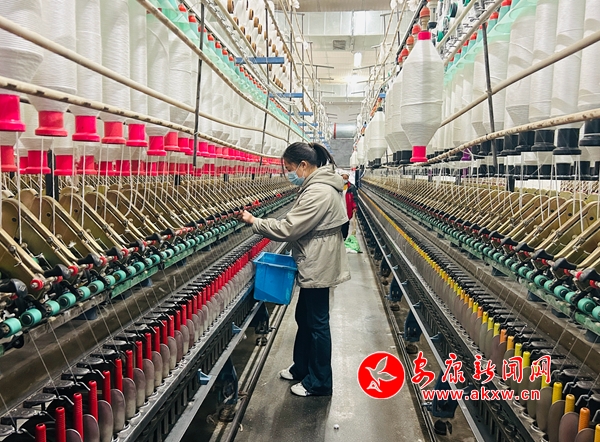 在陜西永豐特種紗線有限公司的生產(chǎn)車(chē)間,工人們忙碌地穿梭于機(jī)器間,雙手不時(shí)調(diào)整著紗線。該公司位于澗池鎮(zhèn)軍壩村,是一家主要從事包芯紗研發(fā)、生產(chǎn)和銷(xiāo)售,紡織原料、面料購(gòu)銷(xiāo)和紡織設(shè)備進(jìn)出口的現(xiàn)代化企業(yè)。