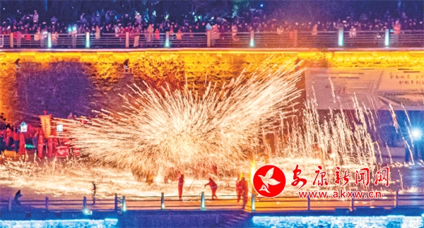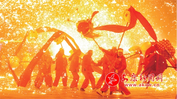 來自寧陜的打鐵花表演將現(xiàn)場氣氛推向高潮。寧陜縣民間社火協(xié)會副會長張宜君說:“在安康市區(qū)來一場打鐵花還是第一次。我們上場共有6個人,給全市人民打鐵花、拜新年?!?/p>