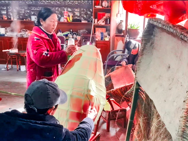 “龍頭是整條龍的重點,刻畫要逼真,色彩還得鮮艷。忙碌了一年的鄉(xiāng)親們,就希望在正月里,抖擻精神,舞動起來?!闭f話間,李忠寶一雙巧手上下翻飛,正在修剪龍頭花燈的胡須,忙得額頭沁出了汗珠。兒子李石磊則忙著幫烤、粘、填、糊、上色……在他們父子倆的精雕細琢下,一個威風凜凜、栩栩如生的花燈道具龍頭,總算扎制完成。
