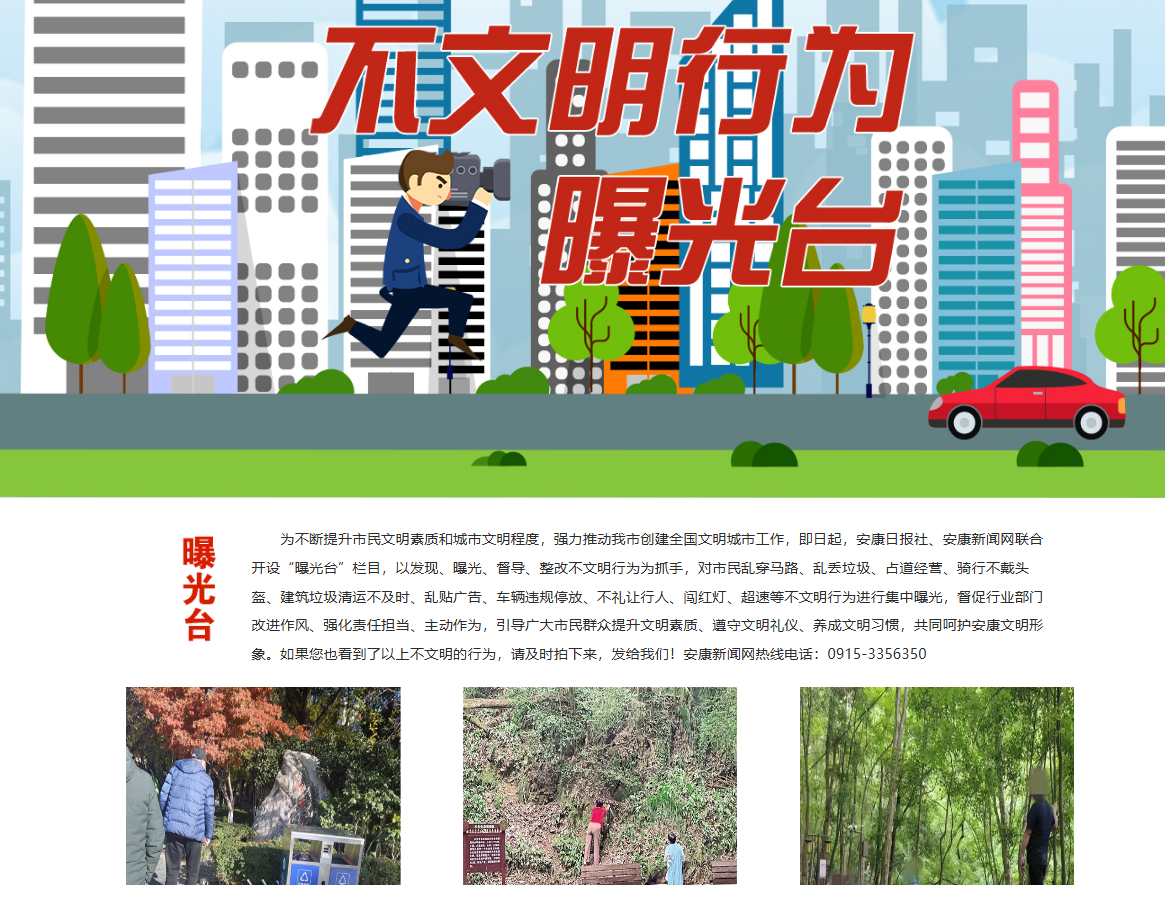 安康新聞網繼續(xù)充分發(fā)揮輿情監(jiān)測和輿論監(jiān)督作用,以高度負責的態(tài)度,及時監(jiān)測上報重大輿情信息。開設《不文明行為曝光臺》輿論監(jiān)督專欄,集中曝光身邊的不文明現(xiàn)象、行為,發(fā)布消息報道19篇,引導市民群眾自覺規(guī)范文明行為,主動融入城市文明創(chuàng)建熱潮,為提升市民文明素質和城市文明程度貢獻媒體力量,體現(xiàn)地方黨媒的責任與擔當。