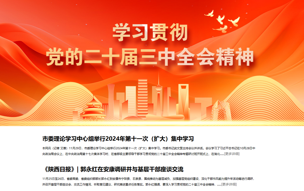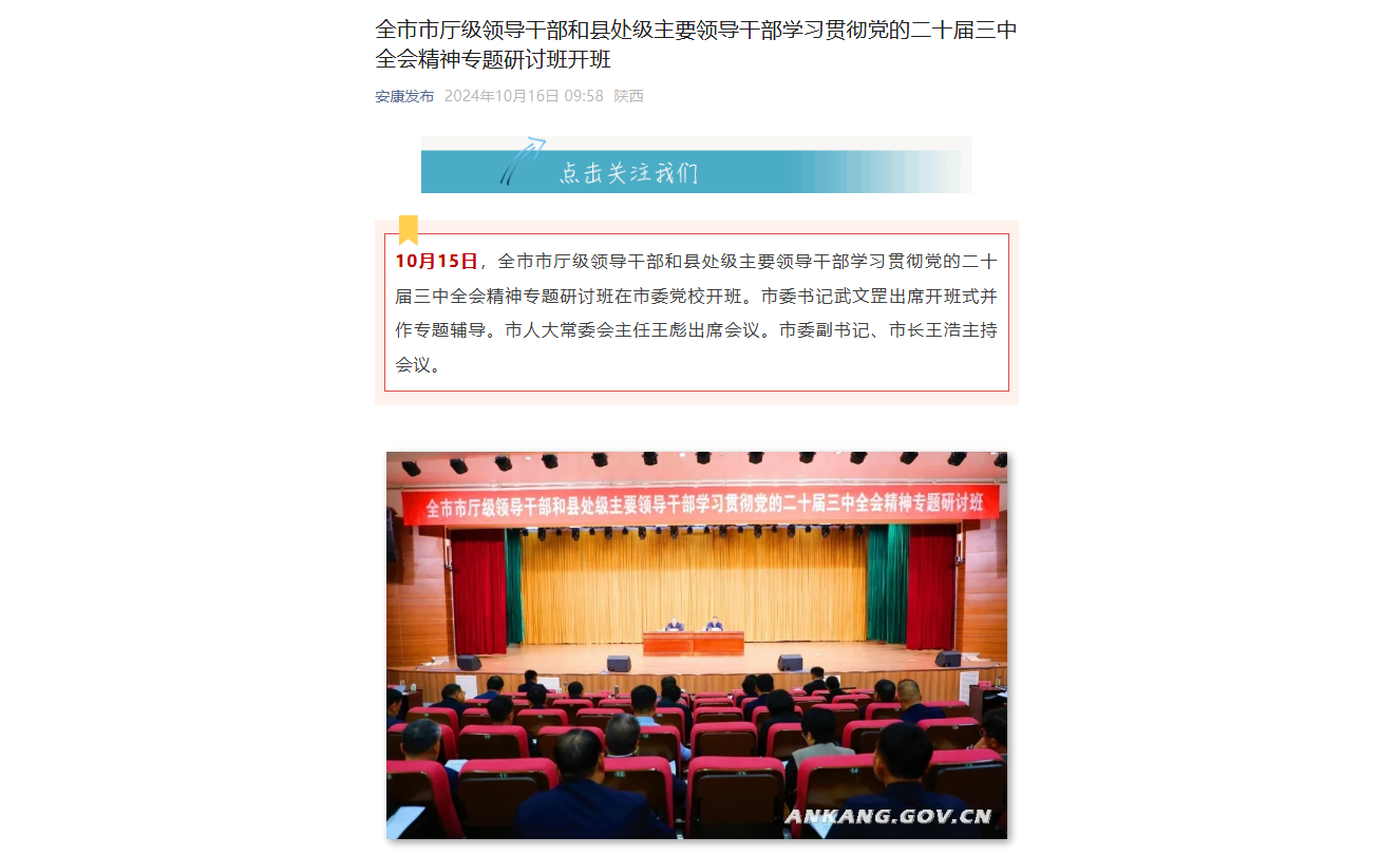 《全市市廳級領導干部和縣處級主要領導干部學習貫徹黨的二十屆三中全會精神專題研討班開班》(2024-10-16發(fā)布于安康發(fā)布公眾號)
