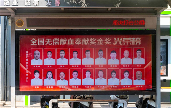 在第22個(gè)世界獻(xiàn)血者日到來之際,安康市中心血站精心策劃,自6月中旬起,在位于市政務(wù)大廳、市中心醫(yī)院、市中心醫(yī)院北院區(qū)門前的三處公交候車亭,以及中心城區(qū)兩處LED大屏上,全天循環(huán)展播著安康市榮獲“全國無償獻(xiàn)血奉獻(xiàn)獎(jiǎng)”終身榮譽(yù)獎(jiǎng)、金獎(jiǎng)、銀獎(jiǎng)、銅獎(jiǎng)的獲獎(jiǎng)?wù)叽盹L(fēng)采照片。