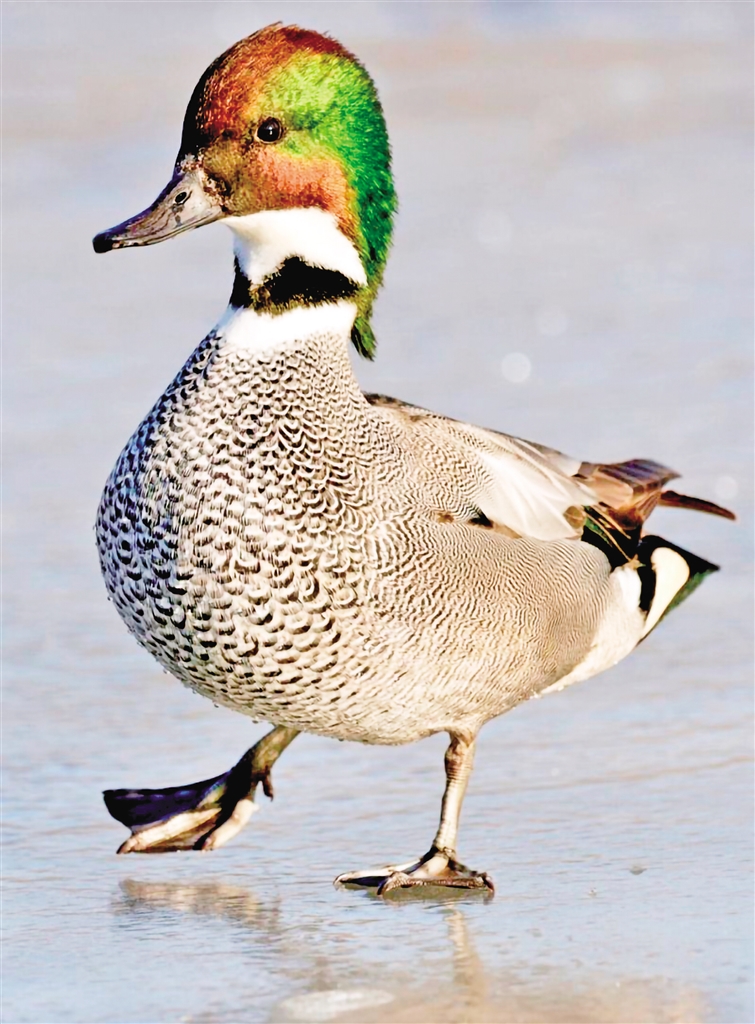 又名葭鳧、鐮刀鴨、扁頭鴨、早鴨、三鴨。雄鳥頭頂至后頸栗色,頭側(cè)及冠羽銅綠色;前頸基部有一黑色領(lǐng)環(huán),上體淺灰色,密布暗褐色波狀細紋;翼鏡綠黑色,三級飛羽延長呈鐮狀;胸黑色密布白色新月形斑,尾下覆羽絨黑色;兩側(cè)具乳黃色斑塊,腋下白色;雌鳥體羽多黑褐色而具黃褐色羽緣,形成明顯的“V”形斑;虹膜褐色,嘴黑灰色,腳暗灰色。因胸、腹、脅部密布由大漸小的黑白波紋,排列成有序的特異圖案,形似編織物而故名。