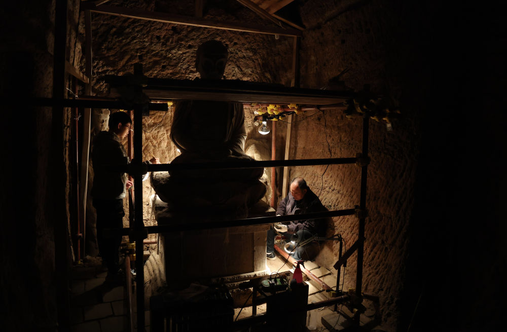 ??2024年11月2日,麥積山石窟藝術(shù)研究所保護(hù)研究室的文物修復(fù)師何舉在麥積山石窟133窟內(nèi)修復(fù)塑像。近年來,麥積山石窟藝術(shù)研究所等文物保護(hù)部門持續(xù)加大對麥積山石窟的搶救性保護(hù)和預(yù)防性保護(hù)工作力度,積極探索現(xiàn)代科學(xué)技術(shù)手段與傳統(tǒng)文物修復(fù)技藝相結(jié)合的保護(hù)修復(fù)新路徑。截至目前,麥積山石窟已有80個洞窟完成整體保護(hù)修復(fù)工作。