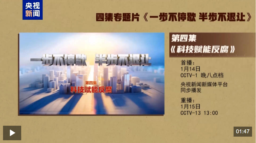 電視專題片《一步不停歇 半步不退讓》第四集《科技賦能反腐》,講述紀(jì)檢監(jiān)察機(jī)關(guān)豐富防治新型腐敗和隱性腐敗有效辦法,以信息化賦能正風(fēng)反腐,充分運(yùn)用科技手段精準(zhǔn)發(fā)現(xiàn)不正之風(fēng)和腐敗問(wèn)題線索、迅速有效突破案件,著力提升智慧反腐、科技反腐水平。總臺(tái)央視綜合頻道1月14日晚8點(diǎn)檔播出,央視新聞新媒體平臺(tái)同步播發(fā)。