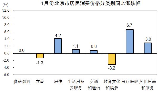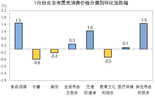 1月份,北京市居民消費(fèi)價(jià)格總水平環(huán)比上漲0.4%。其中,食品價(jià)格上漲2.0%,非食品價(jià)格上漲0.1%;消費(fèi)品價(jià)格上漲0.6%,服務(wù)價(jià)格上漲0.1%。