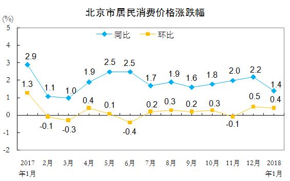 人民網(wǎng)北京2月13日電 據(jù)北京市統(tǒng)計(jì)局網(wǎng)站消息,國(guó)家統(tǒng)計(jì)局北京調(diào)查總隊(duì)、北京市統(tǒng)計(jì)局日前公布2018年1月份北京市居民消費(fèi)價(jià)格變動(dòng)情況。2018年1月份,北京市居民消費(fèi)價(jià)格總水平同比上漲1.4%。其中,食品價(jià)格下降1.5%,非食品價(jià)格上漲2.0%;消費(fèi)品價(jià)格下降0.2%,服務(wù)價(jià)格上漲3.7%。