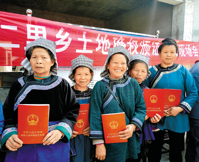 圖為3月14日,在貴州省榕江縣仁里鄉(xiāng)黨民村舉行的土地確權(quán)頒證儀式上,當(dāng)?shù)貗D女領(lǐng)到《農(nóng)村土地承包經(jīng)營權(quán)證》。Jpx安康新聞網(wǎng)