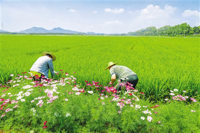 4月2日,博鰲國(guó)家農(nóng)業(yè)公園內(nèi),繁花盛開,水稻郁郁蔥蔥,農(nóng)戶在地里忙碌著。本報(bào)記者 袁琛 攝wRS安康新聞網(wǎng)
