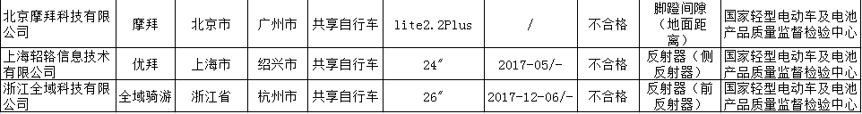 2017年共享自行車(chē)產(chǎn)品質(zhì)量國(guó)家監(jiān)督專(zhuān)項(xiàng)抽查不合格產(chǎn)品及其企業(yè)名單(來(lái)源:國(guó)家質(zhì)檢總局)