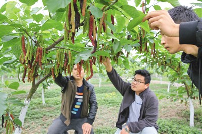 圖為農(nóng)業(yè)技術人員帶客戶查看即將進入采摘期的臺灣四季長果桑葚。XPV安康新聞網(wǎng)