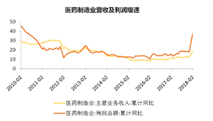 來到2018年一季度前兩月,行業(yè)加速改善態(tài)勢更為明顯。醫(yī)藥制造業(yè)主營業(yè)務(wù)收入同比增長18.3%,利潤總額累計值同比增長37.3%,遠超去年同期,劉可認為,這表明行業(yè)整體環(huán)境在持續(xù)有效改善。