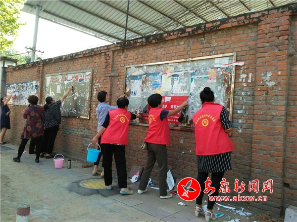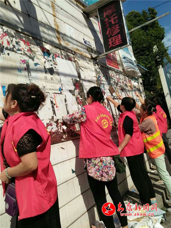 后張嶺社區(qū)組織志愿者、低保戶(hù)和保潔員對(duì)轄區(qū)的小野廣告進(jìn)行集中清理。