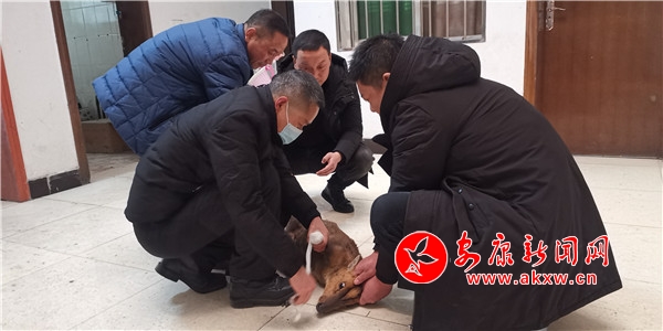 接到報告后,大竹園鎮(zhèn)派出所、農(nóng)綜站、綜合執(zhí)法辦公室三部門聯(lián)合出動,迅速趕往現(xiàn)場,通過現(xiàn)場比對鑒定,發(fā)現(xiàn)這只小動物是國家二級野生保護(hù)動物麂子。為穩(wěn)定麂子傷情,工作人員現(xiàn)場進(jìn)行了傷口處理,并將其帶回鎮(zhèn)農(nóng)綜站邀請獸醫(yī)進(jìn)行診治。