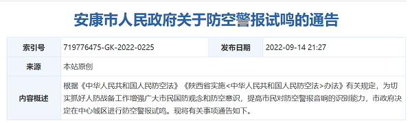 為貫徹落實(shí)《中華人民共和國(guó)人民防空法》,全面提高我市防空警報(bào)快速反應(yīng)和廣大群眾對(duì)警報(bào)音響識(shí)別能力,切實(shí)增強(qiáng)人民群眾的國(guó)防意識(shí)和對(duì)重大自然災(zāi)害的防范意識(shí),安康市政府決定,2022年9月18日(星期日)上午9時(shí)05分至9時(shí)35分在全市試?guó)Q防空警報(bào)。請(qǐng)廣大市民保持正常的工作和生活秩序。