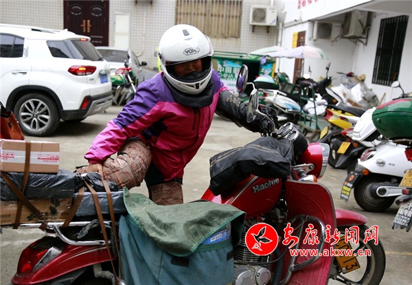 新春之際,陜南天氣依然寒冷。趙明翠戴上頭盔,捆綁好厚厚的護(hù)膝,艱難得跨上摩托車,點(diǎn)火起步出發(fā),開(kāi)始了一天的投遞工作。記者驅(qū)車緊跟隨其后,在很多拐彎和上下坡路段,我們看到趙明翠為了平衡摩托車,經(jīng)常是兩腳尖著地。