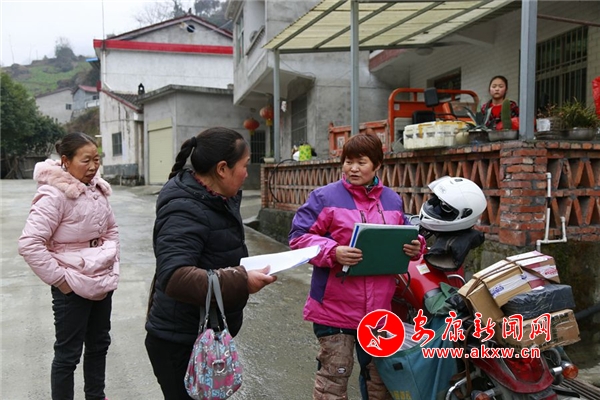 “雷康軍在家嗎?”趙明翠敲開(kāi)曾溪鎮(zhèn)大溝村三組村民雷康軍的家門,屋子里火爐燒得很旺。“我爸上街了,趙阿姨趕快來(lái)坐,把手暖和一下!”雷康軍的女兒一邊招呼著,一邊倒茶水。“你爸有個(gè)包裹要簽收,還有你們家上邊的葛天均也有個(gè)包裹麻煩代收一下,我給葛天均打電話他說(shuō)不在家,讓先放到你們家!”