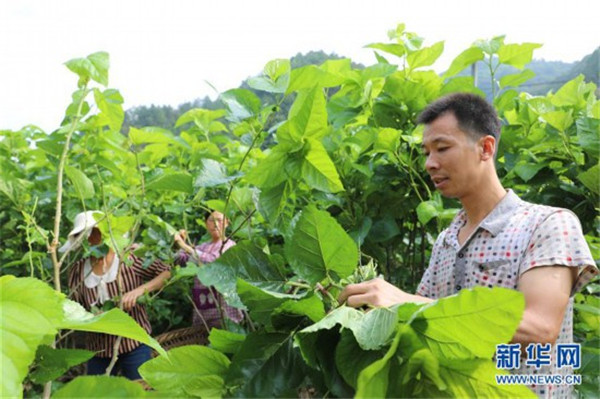 饒峰鎮(zhèn)新華村的養(yǎng)蠶戶邱紅軍(右)在自家的桑樹園內(nèi)采摘桑葉(9月6日攝)。