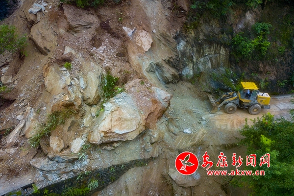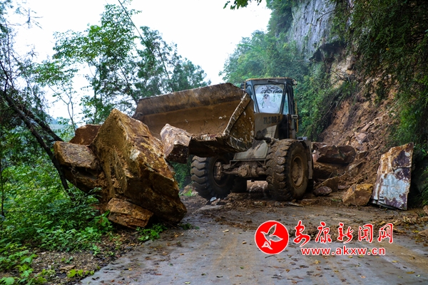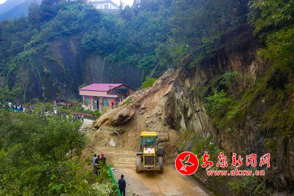 連日來的持續(xù)強降雨導致漢濱區(qū)境內農村公路水毀比較嚴重,多處路段相繼發(fā)生山體滑坡。災情發(fā)生后,漢濱區(qū)農村公路管理局立即組織30余臺大型機械進行搶險,目前已搶通道路40條,還有5條正在搶通中。9月18日,一臺機械正在清理受災道路的垮塌土石。(記者 張喬 通訊員 張昊 攝)vN7安康新聞網