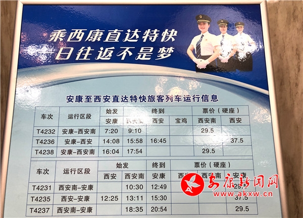 此次新增開的直達特快,從2020年1月10日起,安康至西安南每日開行3對,早上、中午、下午各1對,具體時刻為:T4232次安康早上7:20開、西安南9:10到;T4236次安康中午14:08開、西安南15:58到、西安16:45到;T4238次安康下午16:04開、西安南17:54到。在票價方面,本次直達特快安康至西安南間硬座票價29.50元,安康至西安間硬座票價37.50元。3對直達特快提供硬座、軟臥、硬臥不同席位,以滿足不同旅客出行需求。