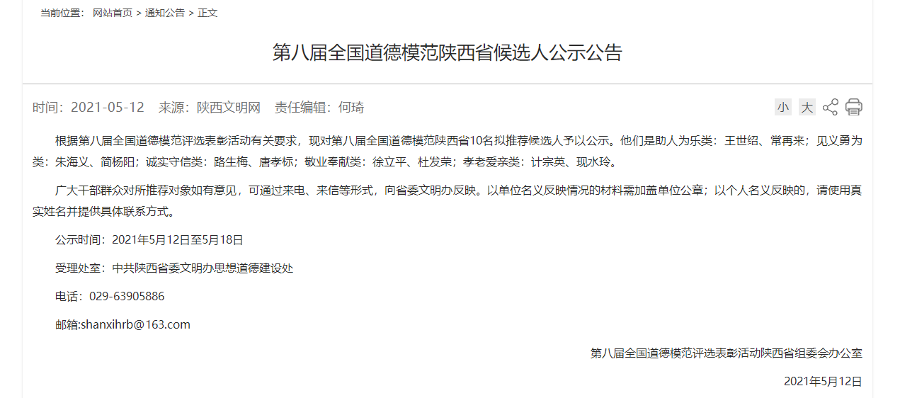 5月12日,陜西文明網(wǎng)發(fā)布第八屆全國道德模范陜西省候選人公示公告,對第八屆全國道德模范陜西省10名擬推薦候選人予以公示,我市旬陽縣居民朱海義入選見義勇為候選人名單。