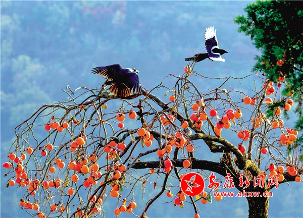 一次在漢濱區(qū)茨溝鎮(zhèn)西溝村拍鳥,當(dāng)時(shí)正值秋收時(shí)節(jié),柿子樹上掛滿了熟透的柿子。張東風(fēng)看到兩位農(nóng)民在摘柿子,但是他們并沒有把樹上的柿子全部摘完,而是留了一些紅彤彤的柿子掛在樹上。