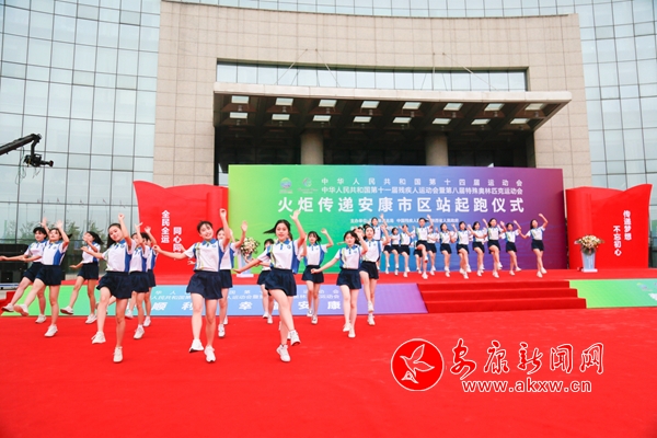 暖場節(jié)目漢劇歌舞《春色滿園樂安康》和安康高新中學(xué)學(xué)生表演的健身操《天天向上》,點(diǎn)燃了現(xiàn)場喜慶的氣氛。上午8時(shí),火炬?zhèn)鬟f起跑儀式正式開始。4名國旗護(hù)衛(wèi)禮兵高舉中華人民共和國國旗,邁著整齊有力的步伐進(jìn)入儀式現(xiàn)場,全場齊聲同唱《中華人民共和國國歌》,嘹亮的旋律激蕩人心、催人奮進(jìn)。