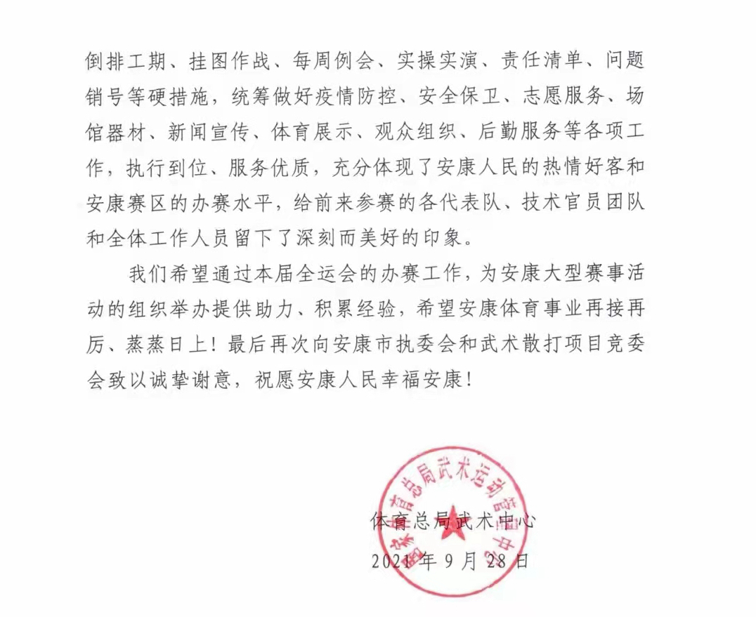 本網(wǎng)訊 9月28日,國家體育總局武術(shù)運動管理中心向我市發(fā)來感謝信,對我市高質(zhì)量的競賽組織和服務(wù)保障等工作表示感謝。