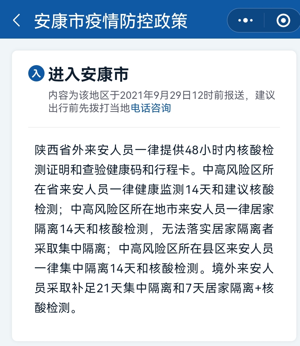 另?yè)?jù)我市最新疫情防控措施要求,陜西省外來安人員,需提供48小時(shí)內(nèi)核酸檢測(cè)證明和查驗(yàn)健康碼和行程卡。中高風(fēng)險(xiǎn)區(qū)所在省來安人員,需要健康監(jiān)測(cè)14天并建議核酸檢測(cè);中高風(fēng)險(xiǎn)區(qū)所在地市來安人員,需居家隔離14天和核酸檢測(cè),無法落實(shí)居家隔離者將采取集中隔離;中高風(fēng)險(xiǎn)區(qū)所在縣區(qū)來安人員一律集中隔離14天和核酸檢測(cè)。境外來安人員采取補(bǔ)足21天集中隔離和7天居家隔離+核酸檢測(cè)。