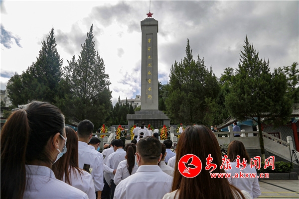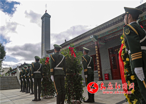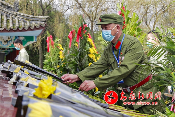 隨后,《獻花曲》奏響,禮兵列隊入場,將花籃整齊擺放在紀念碑基座上。趙俊民拾級而上緩步行至紀念碑前,仔細整理花籃緞帶,全體人員向革命烈士三鞠躬,表達緬懷之情。參加活動的市級領導和各界代表也依次敬獻鮮花并瞻仰烈士紀念碑。