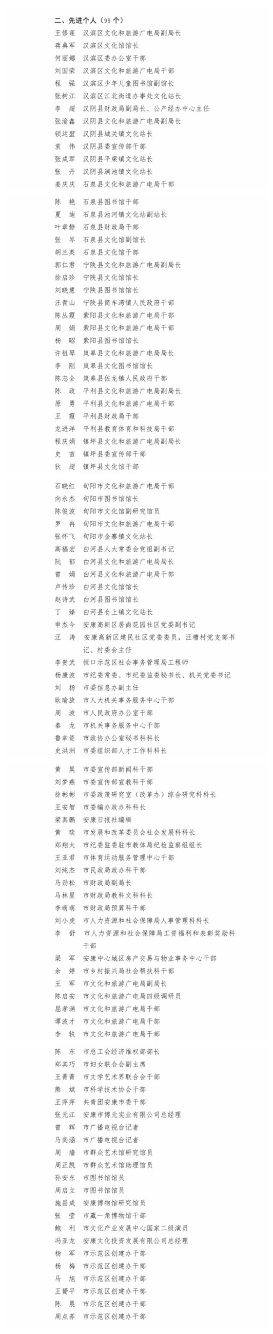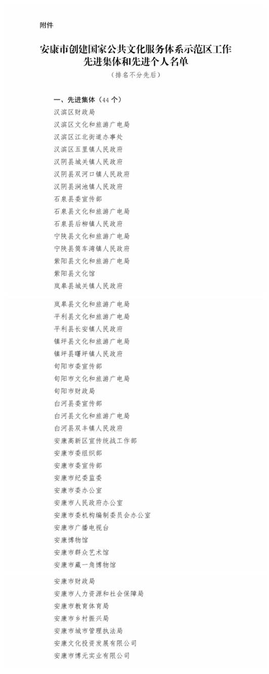 近日,中共安康市委、安康市人民政府下發(fā)了《關(guān)于表彰創(chuàng)建國家公共文化服務(wù)體系示范區(qū)工作先進集體和先進個人的決定》,具體內(nèi)容如下: