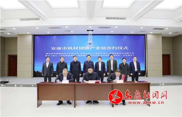 會上,趙俊民還就組建市釩材儲能產(chǎn)業(yè)鏈鏈長制工作專班、推動液流儲能示范應(yīng)用等事宜作了安排部署,對與會人員提出的問題作了一一回應(yīng)。華電陜西能源有限公司分別與華秦儲能技術(shù)有限公司、恒口示范區(qū)簽訂了合作協(xié)議。