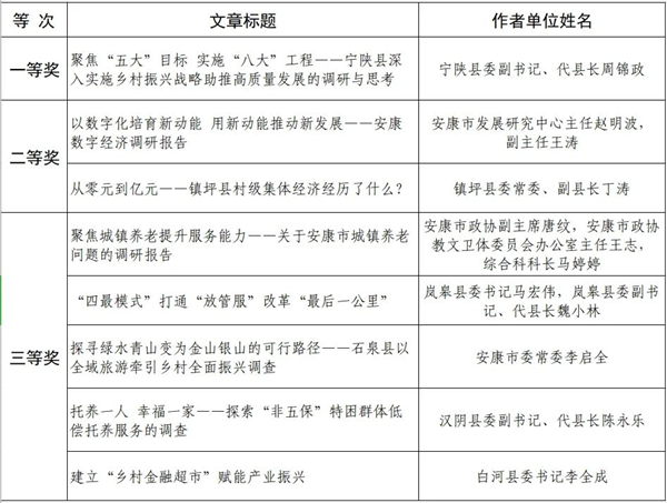 6月14日,省委政策研究室、省政府研究室聯(lián)合印發(fā)《關(guān)于表彰2021年度全省黨政領(lǐng)導(dǎo)干部?jī)?yōu)秀調(diào)研成果的通報(bào)》,對(duì)獲獎(jiǎng)的優(yōu)秀調(diào)研成果進(jìn)行通報(bào)表彰。安康8篇調(diào)研成果獲表彰,其中一等獎(jiǎng)1篇、二等獎(jiǎng)2篇、三等獎(jiǎng)5篇。評(píng)選中,市委政研室(改革辦)嚴(yán)格按照上級(jí)要求,認(rèn)真完成調(diào)研成果收集、篩選、匯總、報(bào)送等程序,共上報(bào)各級(jí)各類(lèi)調(diào)研成果34篇。(注:以下領(lǐng)導(dǎo)職務(wù)以2022年3月文章統(tǒng)一上報(bào)省委政研室時(shí)為準(zhǔn))