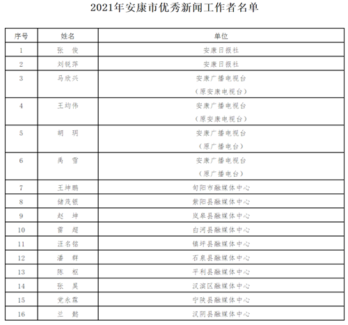 擬授予張俊等16名同志“安康市優(yōu)秀新聞工作者”榮譽(yù)稱號(hào)。