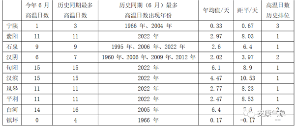 全市除寧陜、鎮(zhèn)坪外,其余各縣(區(qū)、市)高溫日出現(xiàn)6至15天不等,其中旬陽、漢濱高溫日數(shù)最多為15天,其中漢濱高溫日數(shù)較同期平均偏多10天左右;全市高溫日數(shù)有6縣(區(qū)、市)為6月歷史同期第一。6月極端最高氣溫出現(xiàn)在白河縣構(gòu)扒,24日15時23分,41.9℃。