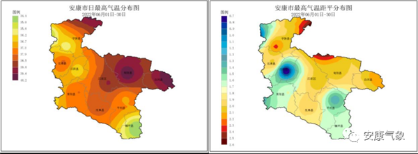 6 月日最高氣溫(左)和最高氣溫距平(右)分布圖