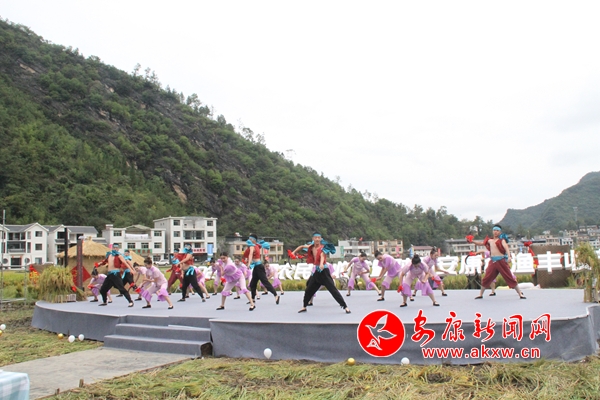 在純凈的背景下,舞蹈《歡天喜地慶秋收》、歌伴舞《開缸酒》、漁鼓道情《生態(tài)旅游興旬陽(yáng)》、小品《電商助農(nóng)促豐收》、表演唱《群雁回歸興鄉(xiāng)村》、《咱老百姓》、歌舞《追夢(mèng)綠色向未來》等節(jié)目精彩上演, 獨(dú)特的舞臺(tái)形式將豐收盛景定格在畫卷中,舞者起舞慶豐收,舞出了農(nóng)人心中的喜悅,傳遞著農(nóng)人豐收的幸福。