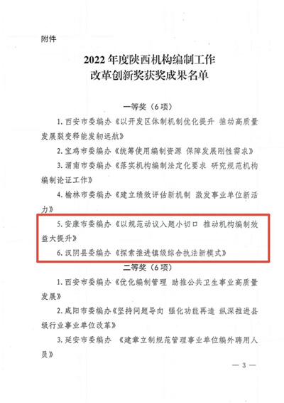日前,2022年度陜西省機(jī)構(gòu)編制工作改革創(chuàng)新獎評選結(jié)果揭曉,入選全省機(jī)構(gòu)編制系統(tǒng)20項獲獎成果中,我市3項改革創(chuàng)新成果斬獲一等獎2名、二等獎1名,獲獎等次和數(shù)量位居全省第一。