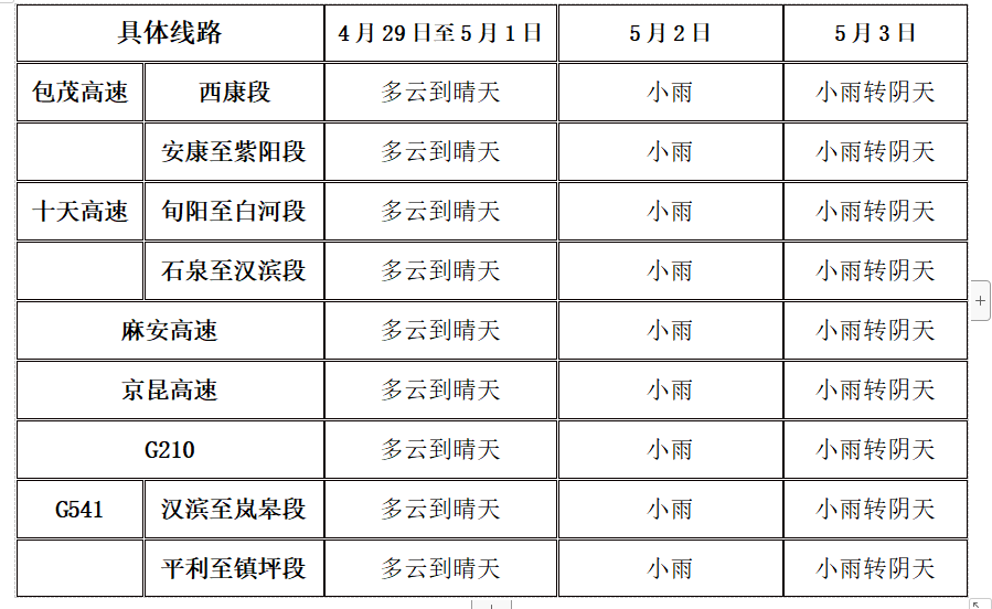 “五一”前期,前期天氣相對適宜出行,后期受降水天氣影響,包茂高速、麻安高速、十天高速、G541等路段需注意低能見度及道路濕滑對交通安全的不利影響,出行注意安全,另外返程期間可能出現(xiàn)交通擁堵,出行需提前規(guī)劃好路線以免受到影響。
